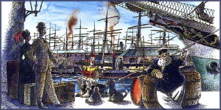 I'm Captain Matt said a deep friendly voice. Please Captain I'm Morris said the little monorail, and I only wanted to see how my harbour looked at night. Your harbour you say, said Captain Matt, I suppose it is beautiful now, but let me show you how it looked a hundred years ago when it was my harbour. The Captain waved his hand and to the little Monorail's astonishment everything changed. |